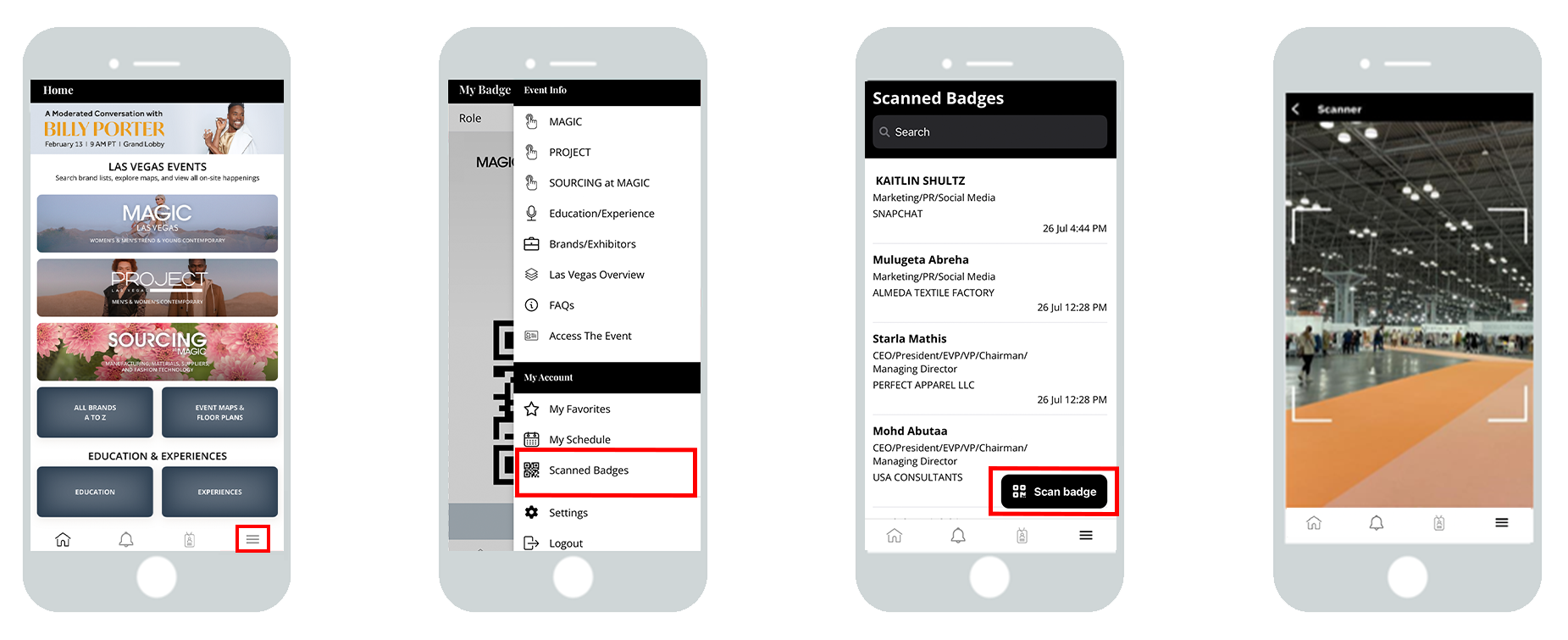 Exhibitors can view the badges that they’ve scanned by navigating to Badge Scanning in the app.
